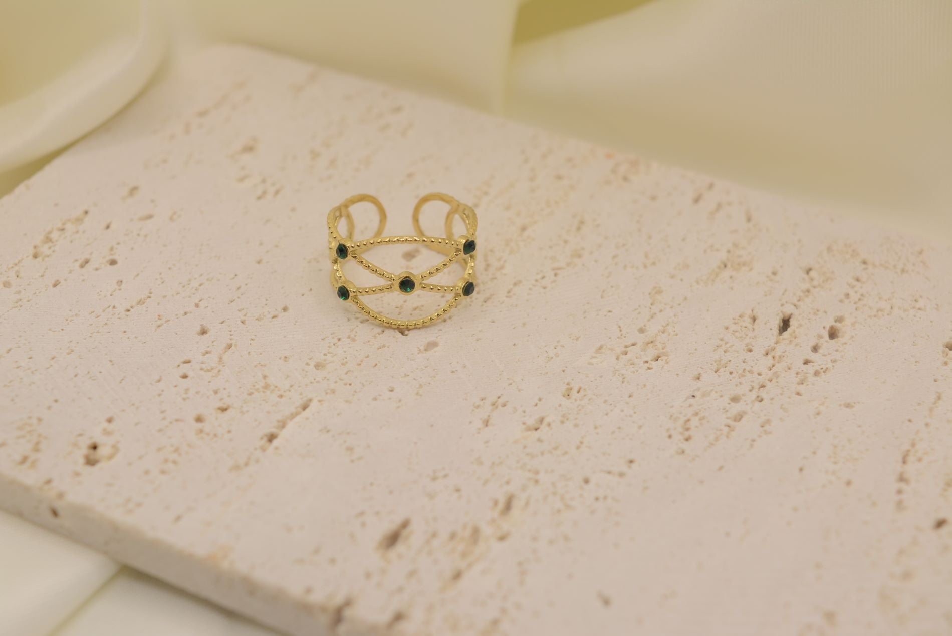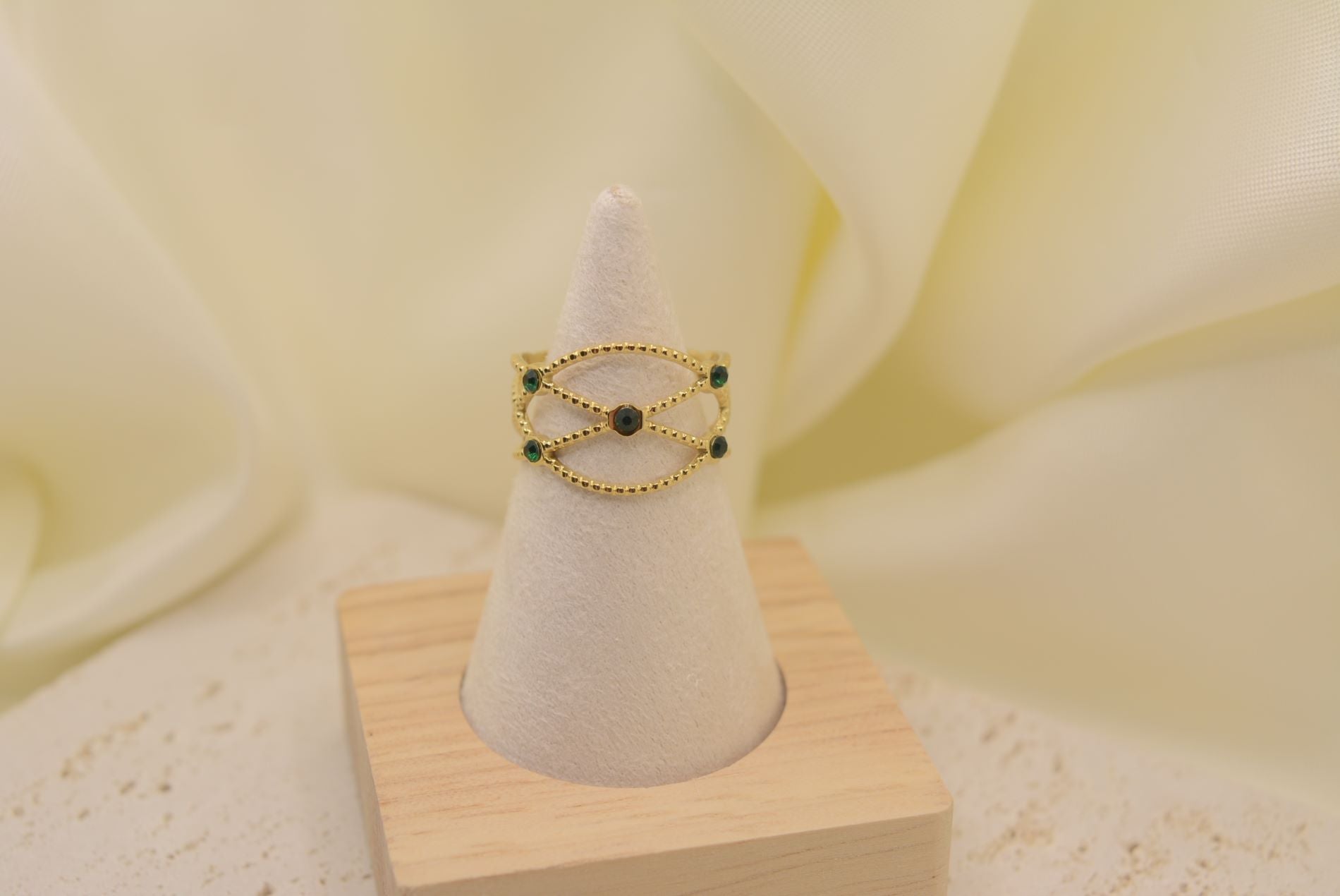 La magnifique bague Athena est un parfait mélange de doré et d'acier inoxydable, créant un look sophistiqué. Les pierres de paon synthétiques apportent une touche de couleur subtile. Avec ses lignes croisées et sa taille réglable, elle convient à toutes les occasions et à tous les doigts.