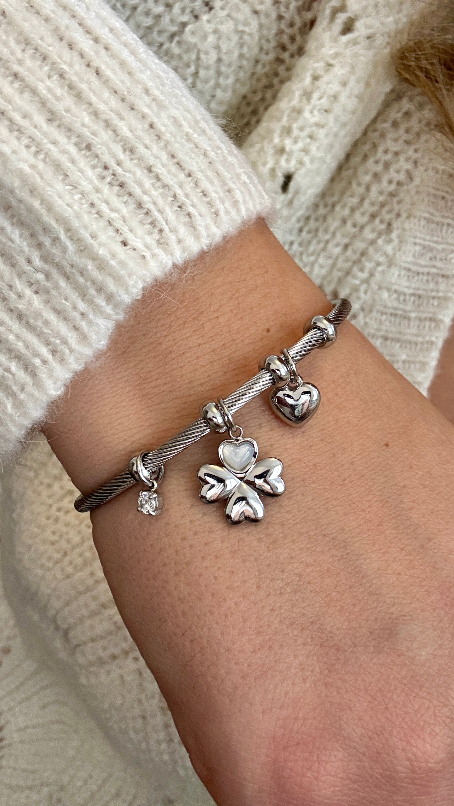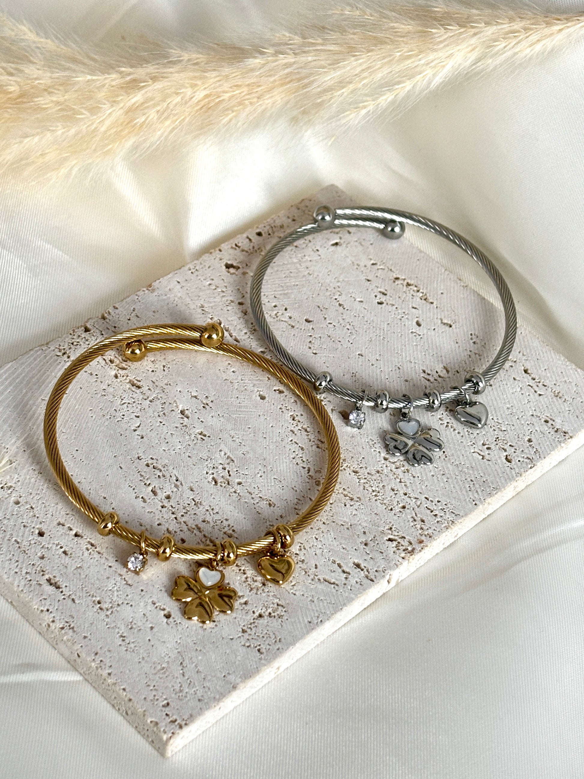 Le bracelet Agnès allie charme intemporel et signification profonde. Ce jonc ajustable, disponible en acier inoxydable doré et argenté, est orné de délicates breloques représentant un trèfle porte-bonheur, un cœur symbolisant l’amour, et des strass scintillants pour une touche d’élégance.