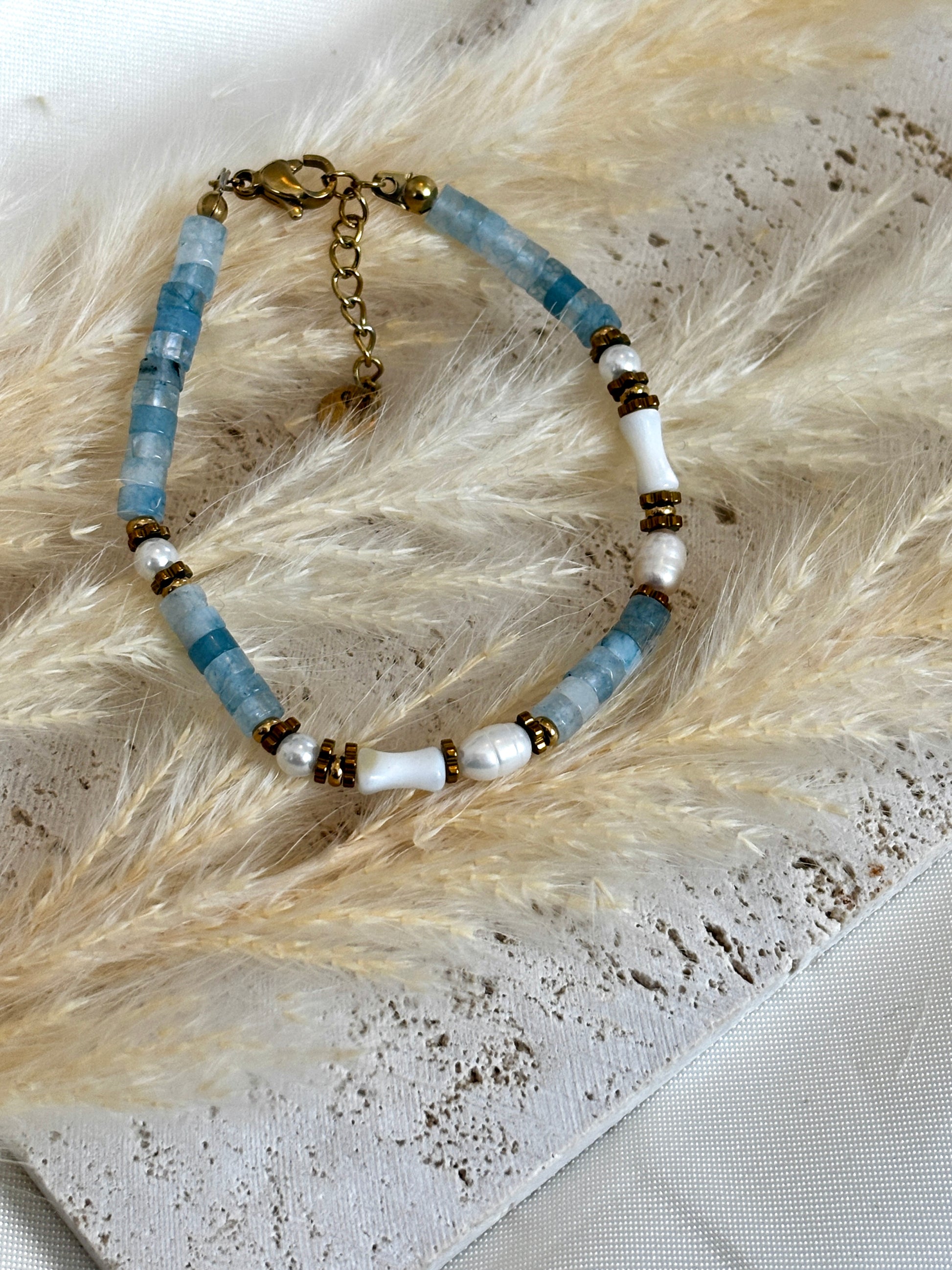 Inspiré par les teintes douces du ciel étoilé, le bracelet Celestia mêle harmonieusement des pierres naturelles bleu ciel, blanc nacré et des éclats dorés lumineux. Chaque perle évoque la pureté des nuages, la profondeur de l’azur et la chaleur solaire de l’or.