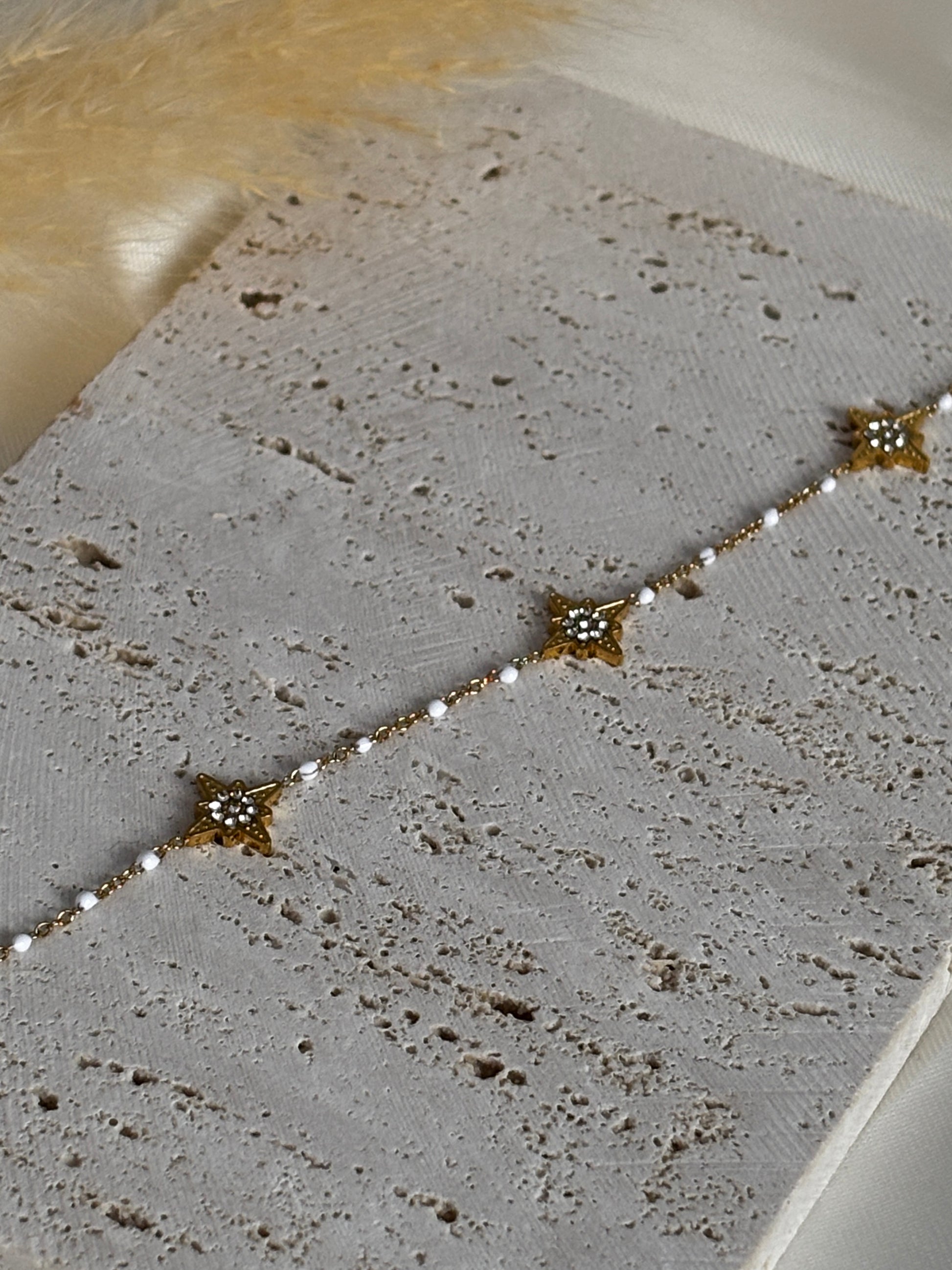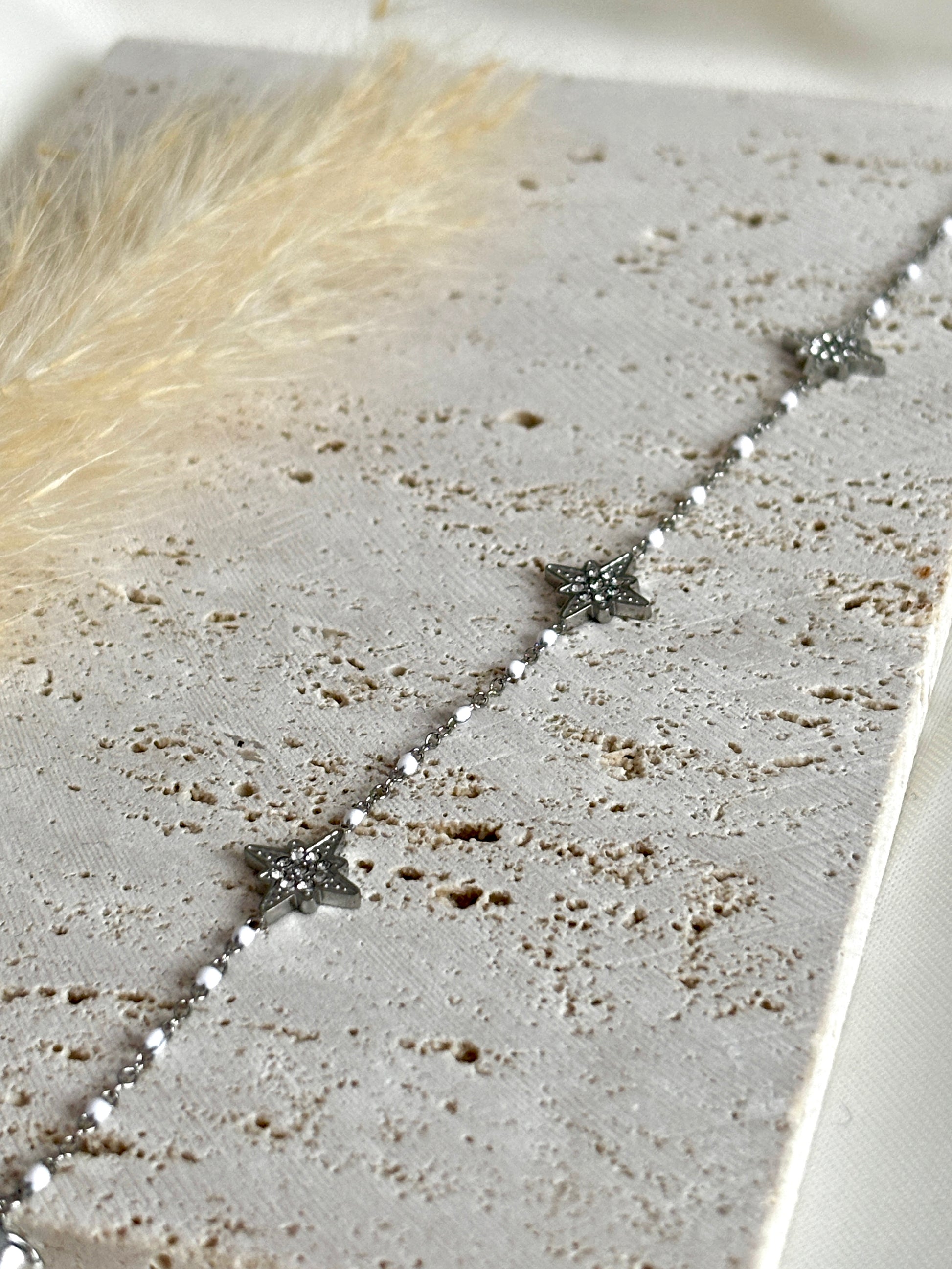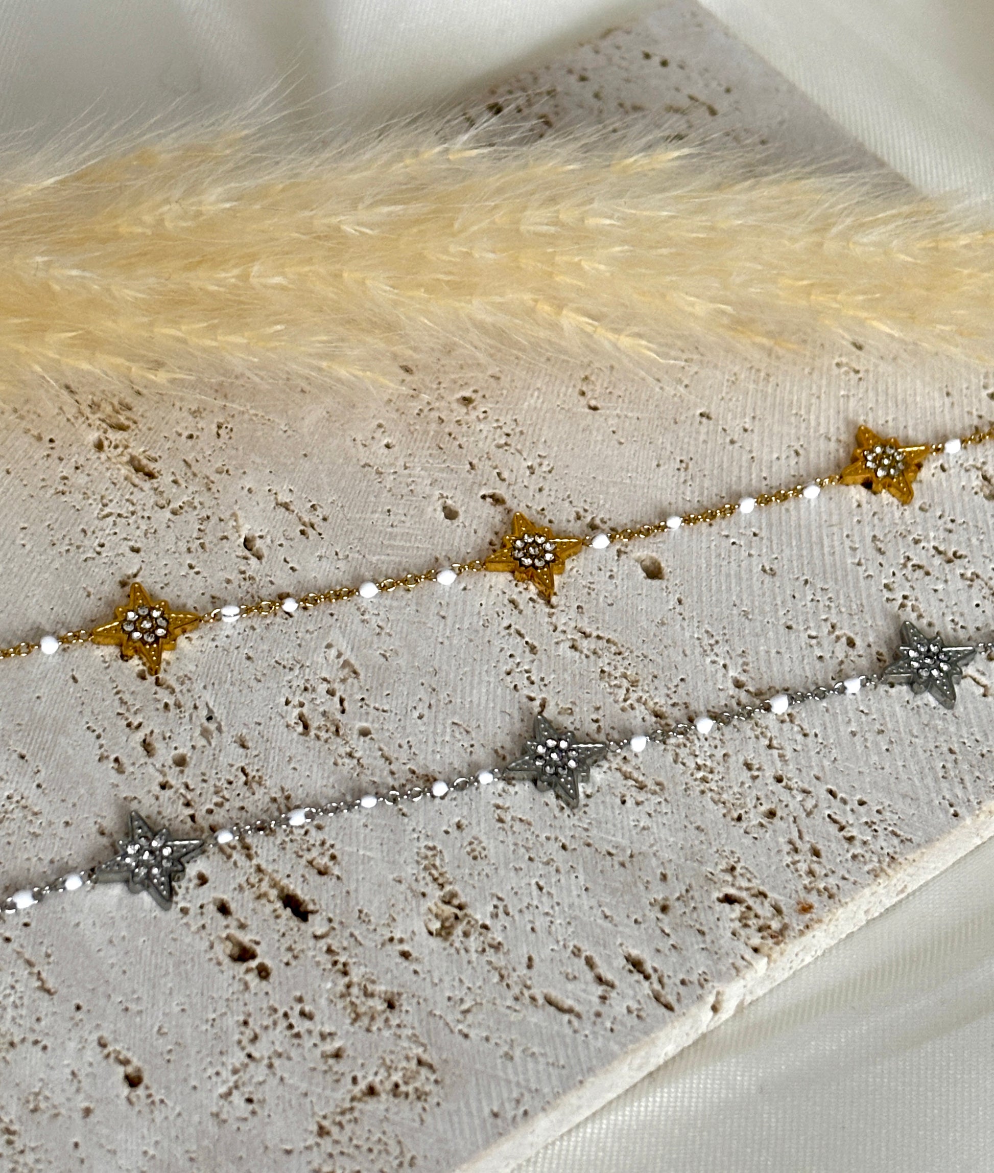 Ce bijou raffiné en acier inoxydable est orné de petites étoiles serties de strass scintillants, évoquant un ciel étoilé autour de votre poignet. Sa fine chaîne ajustable de 15 + 5 cm garantit un confort parfait et une touche d’élégance discrète pour toutes les occasions.