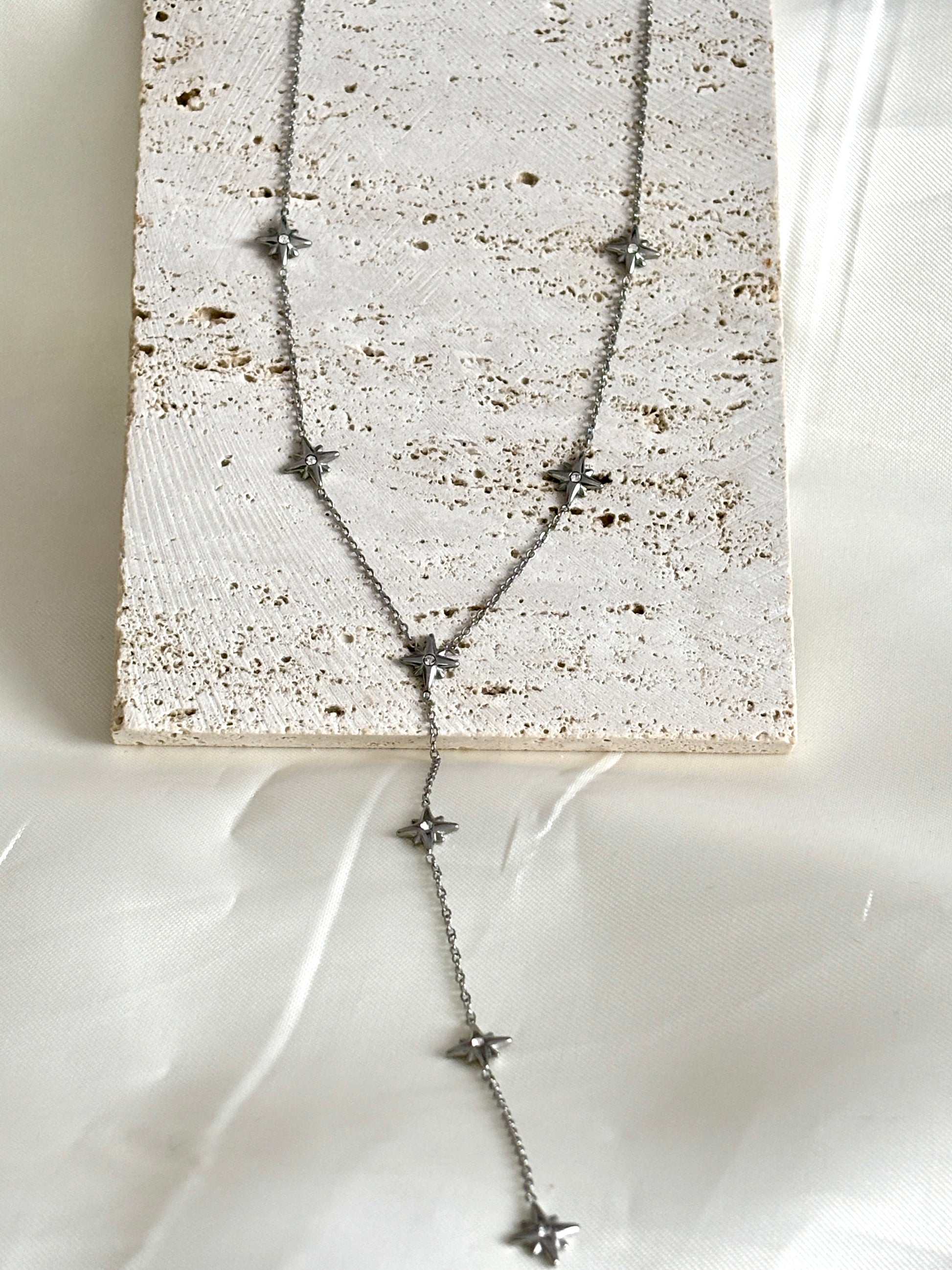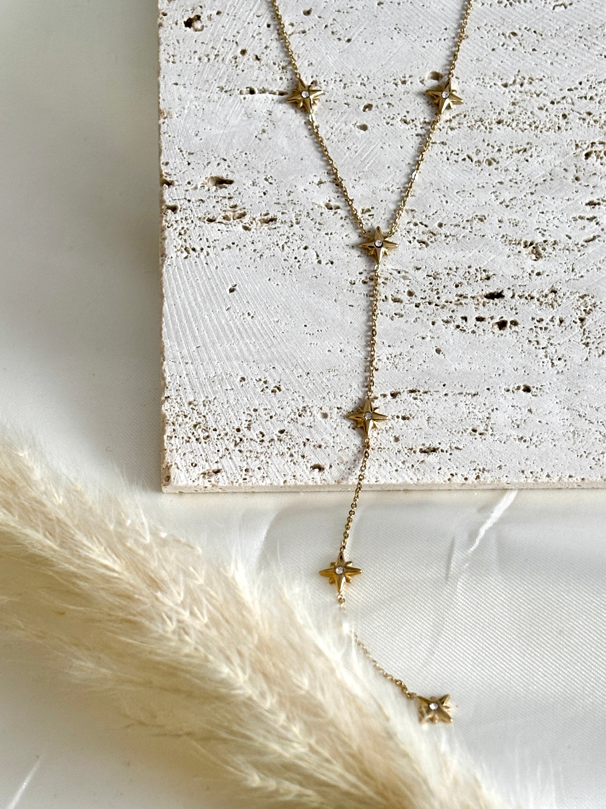 Apportez une touche céleste à votre style avec ce collier en Y raffiné, sublimé par des motifs étoiles délicats et des strass étincelants. Confectionné en acier inoxydable, il garantit durabilité et éclat intemporel. Sa chaîne fine et élégante, disponible en finitions dorée et argentée.